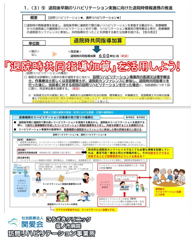 また、そのリハビリの内容について退院前カンファレンスに訪問リハビリや通所リハビリのリハビリ専門職が参加した場合、制度上「退院時共同支援加算」の算定対象となりますが、これは加算を目的として参加するものではなく、退院後の生活を具体化し、支援体制を整えた結果として評価されるものと考えています。